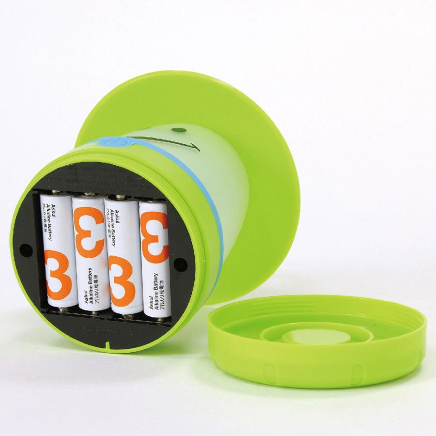 使い方も単純で、お腹の部分にあるボタンをオンオフするだけの単純機能。押すときに少し力が入りますが、慣れるとこどもでも簡単に使うことができます。